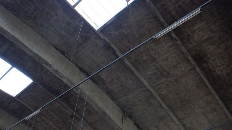 The in-situ cast concrete arches are 50m (165ft) span, 13m (42ft) high and at 13m (42ft) centres. The tensile concrete shell roof between the arches was designed to be 64mm (2.5in) thick and was cast with large rooflight penetrations along the apex of the roof.